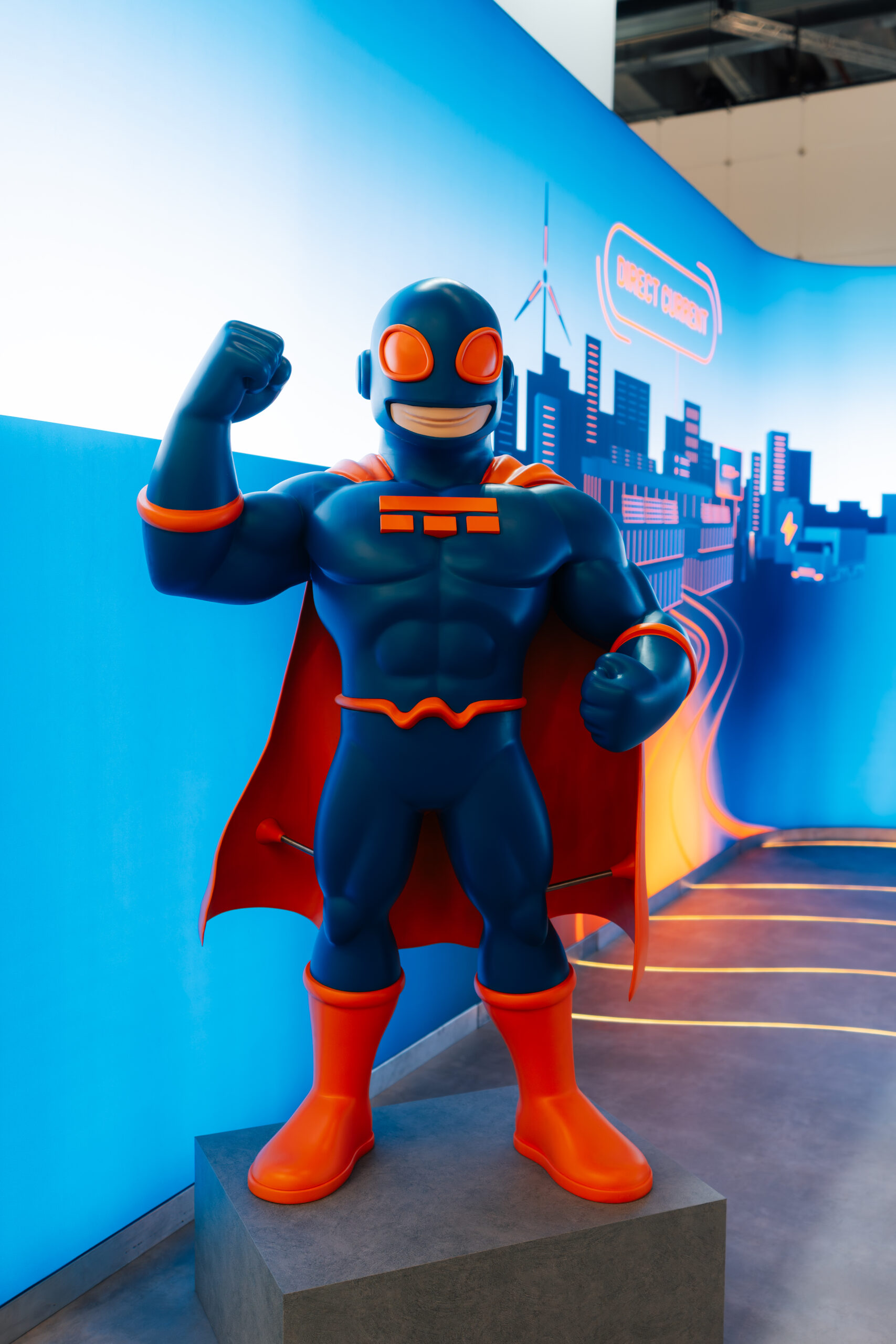 Der Superheld steht sinnbildlich für die Stärke und das Potenzial von Direct Current Netzwerken. Gleichzeitig übernimmt er eine wichtige kommunikative Funktion im Messestand Konzept. Als visuelles Leitmotiv führt die Figur durch den gesamten Auftritt und schafft eine emotionale Verbindung zum Thema.